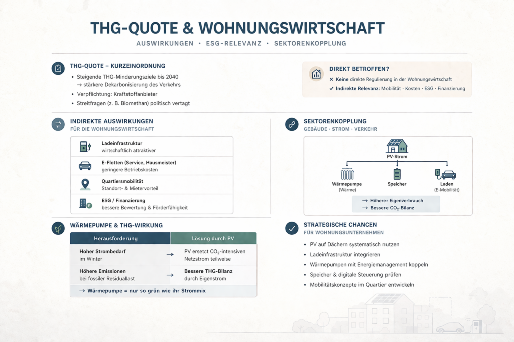 Die THG-Quote betrifft die Wohnungswirtschaft nicht unmittelbar regulatorisch, erzeugt aber mittelbar erhebliche wirtschaftliche und strategische Effekte. Besonders relevant sind: