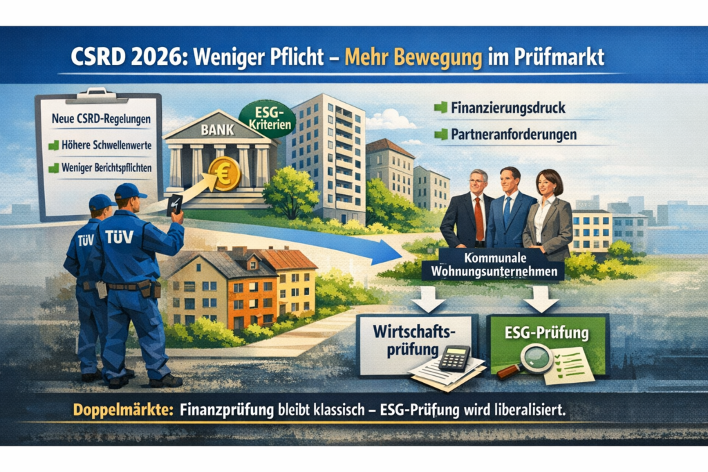 Erstens entstünde echter Wettbewerb im ESG-Prüfmarkt. Für wohnungswirtschaftsnahe Wirtschaftsprüfer oder andere verbandsnahe Einheiten ginge es dann nicht um den Verlust der klassischen Jahresabschlussprüfung, sondern um den Verlust eines zusätzlichen, wachsenden Prüf- und Beratungsfelds. In der Wohnungswirtschaft wird Nachhaltigkeitsberichterstattung bereits als eigenes Leistungsfeld aufgebaut; zugleich betonen Verbände und kommunale Unternehmen den hohen Druck aus Klimazielen, Regulierung und Investitionsbedarf.