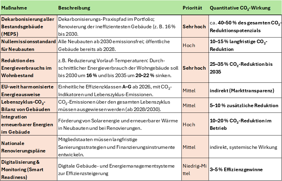 Im Folgenden sind die wichtigsten Maßnahmen der Richtlinie strukturiert dargestellt und nach Priorität und CO₂-Wirkung bewertet (hoch – mittel – gering). Die quantitative Wirkung basiert auf typischen Studien zum EU-Gebäudesektor und den in der Richtlinie genannten Einsparzielen.