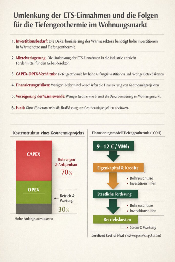 Der Vorschlag, ETS-Einnahmen vollständig für industrielle Dekarbonisierung zu nutzen, adressiert einen wichtigen Teil der Energiewende. Gleichzeitig zeigt das Beispiel der Tiefengeothermie, dass andere Transformationsbereiche stark von denselben Finanzierungsquellen abhängen. Während steigende CO₂-Preise die laufende Wirtschaftlichkeit erneuerbarer Wärme verbessern können, bleibt der zentrale Engpass der Wärmewende die Finanzierung hoher Anfangsinvestitionen.