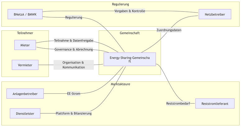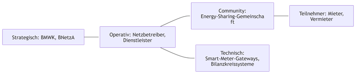 Die Bundesnetzagentur wird zur zentralen Instanz im Energy Sharing. Sie definiert MaKo-Prozesse, legt Bilanzierungsregeln fest und überwacht die technische Umsetzung. Zugleich muss sie Konflikte zwischen Netzbetreibern, Lieferanten und Communities moderieren. Ihre Rolle ist regulatorisch, technisch und marktgestaltend zugleich, wodurch sie erheblichen Einfluss auf die Skalierbarkeit des Modells erhält.