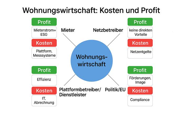 Energy Sharing unterscheidet sich grundlegend von Eigenverbrauch oder Mieterstrom, da keine Netzentgeltprivilegien vorgesehen sind. Die Wirtschaftlichkeit hängt daher fast vollständig von der Differenz zwischen Erzeugungskosten und Strommarktpreis ab. Dies ist auch eine große Chance und birgt unausgeschöpftes Kostensenkungs-Potenzial für Mieter. Für Vermieter und Mieter sind Einsparpotenziale erheblich und bedeuten einen willkommenen Gestaltungsrahmen der Zukunft; KMU haben größere Vorteile durch höhere Tageslastprofile. Verwaltungs- und Plattformkosten reduzieren die Marge.